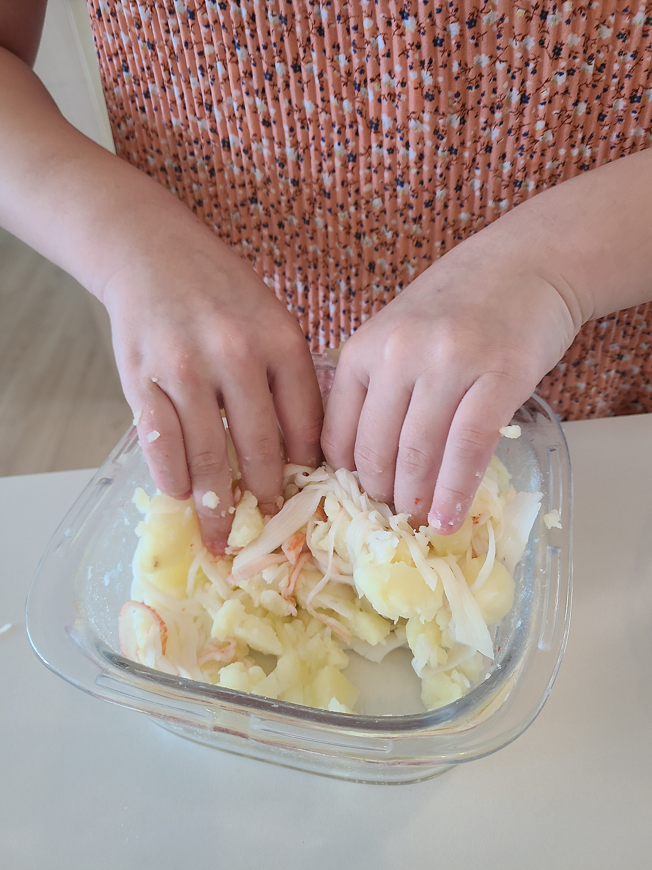 뽀득뽀득 손 씻고, 할머니 같다고 아빠의 놀림을 받는 잔 꽃무늬 앞치마를 걸치고 조리대 앞에 선 네 표정이 사뭇 비장하다. 오늘의 요리는 3가지. 감자와 게맛살이 메인 재료다. 감자칼은 위험하니 조교의 도움이 필요하다. 까놓은 감자를 셰프님에게 전달하면 날이 무딘 빵칼로 조각조각 작게 썰어둔다.