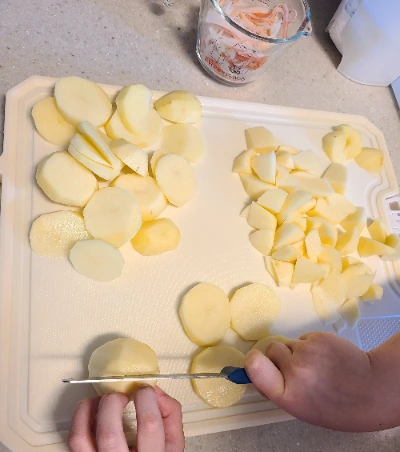 셰프님, 감자의 익힘 정도가 이븐(even)하게 익어야 하니 더 작게 썰어주세요. 조교의 충언을 듣고 성실히 이행하는 꼬마 세프님. 집중할 때만 나오는 힘 꼭 주고 앙다문 입술 모양이 꼭 참새 부리 같다.
