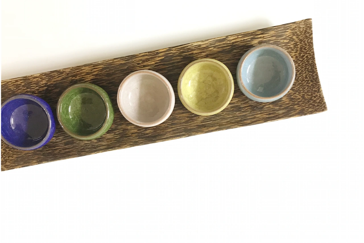 집으로 가져와 나무로 만든 접시 위에 나란히 올려두고, 용도가 불분명한 다섯 개의 작은 그릇에 물을 담으니