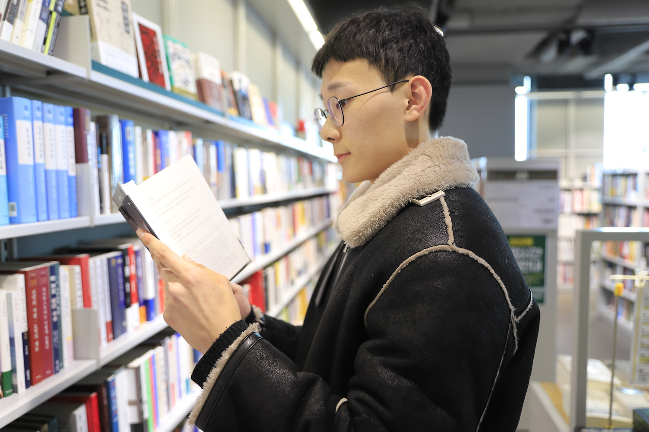 ▲김용선 학생은 서점을 좋아하는 모습에서 진지한 독서의 열정을 엿볼 수 있다.사진 속 김용선 학생은 서가에 둘러싸인 채, 책을 손에 들고 깊은 생각에 잠긴 모습이다. 뒤늦게 중학교 3학년 때부터 서점에서 책을 탐색하며 새로운 세상에 대한 호기심과 발견의 기쁨을 느꼈다고 말한다. 이어 <또 사랑 시나 쓰고 앉아 있네>시집 32권을 기증하면서도, 누군가가 이 책을 통해 위로를 받고, 작은 감동을 느낄 수 있기를 바라는 마음이 담겨 있다. ⓒ 김정아