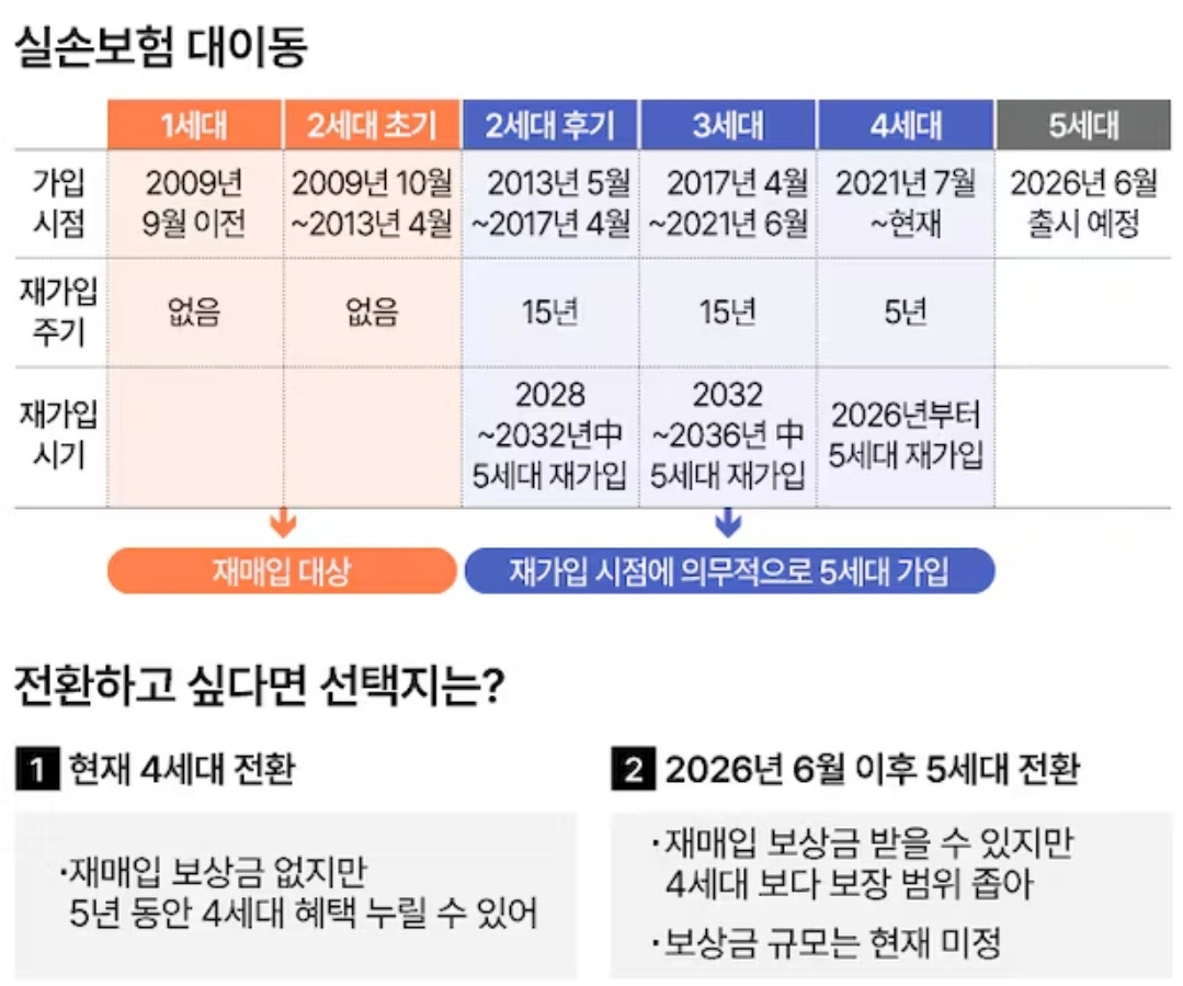 문제는 1·2세대 보험은 평생 유지할 수 있지만, 3·4세대 보험은 몇 년마다 재가입을 해야 해서 자연스럽게 5세대로 넘어가게 되는 구조예요.