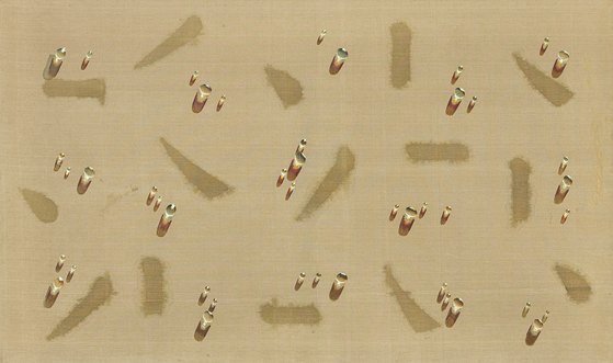 김창열 화백의 작품이다. '물방울' 작가로 널리 알려지셨는데 이 물방울은 치유, 순환, 생명의 의미가 있다. 널찍한 캔버스 바탕은 채도 낮은 한문의 획과 영롱한 물방울이 균형을 이루며 구성미를 돋보인다. 물방울이 빼곡한 작품도 있고, 물방울이 단지 7개뿐인 작품도 있지만 이 모두 피곤치 않은 적당한 균형과 조화를 이룬다는 점이 작품의 완성도를 높인다.
