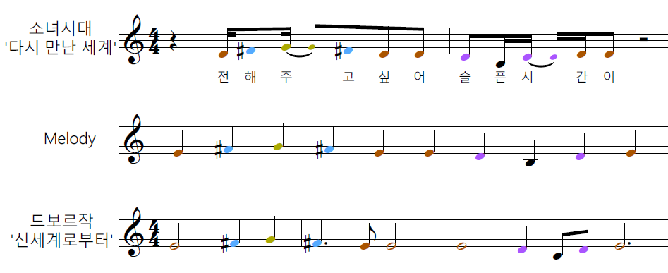 가장 아래쪽에 위치한 악보가 드보르작의 ‘신세계로부터’의 멜로디를 간단히 옮긴 것이고,