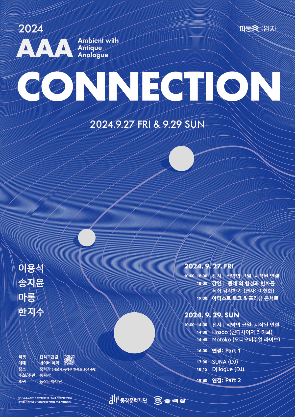 "앰비언트 뮤직과 기악음악의 만남, Ambient with Antique Analogue가 작년에 이어 돌아왔습니다. 올해는 동작문화재단과 함께, 도시와 사람을 '연결'하는 예술가들의 여정을 담은 프로젝트를 진행했습니다. 4인의 아티스트가 동작구 전역을 돌아다니며 경험하고 채집한 소리들이 공연으로 탈바꿈되어 여러분들과 다시 연결하는 시간이 될 예정입니다.
