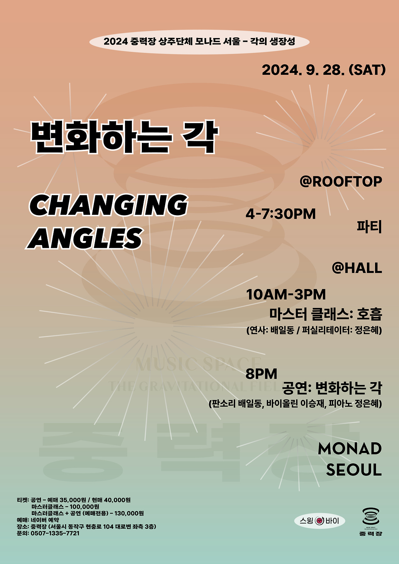 "지난 5월, 봄날 옥상에서의 근사한 파티와 모나드 서울의 열정적인 연주로 화려하게 시작했던 2024 중력장 상주단체 공연 시리즈가 돌아왔습니다. 9월에는 배일동 명창의 마스터클래스 ‘호흡’과 더불어 배일동, 정은혜, 이승재 3인의 자유즉흥연주가 마련됩니다. 초가을의 쾌청한 날씨에 즐기는 루프탑 파티가 함께할 이번 공연에서 음악인과 관객과의 놀라운 호흡이 맞춰지기를 기대합니다."