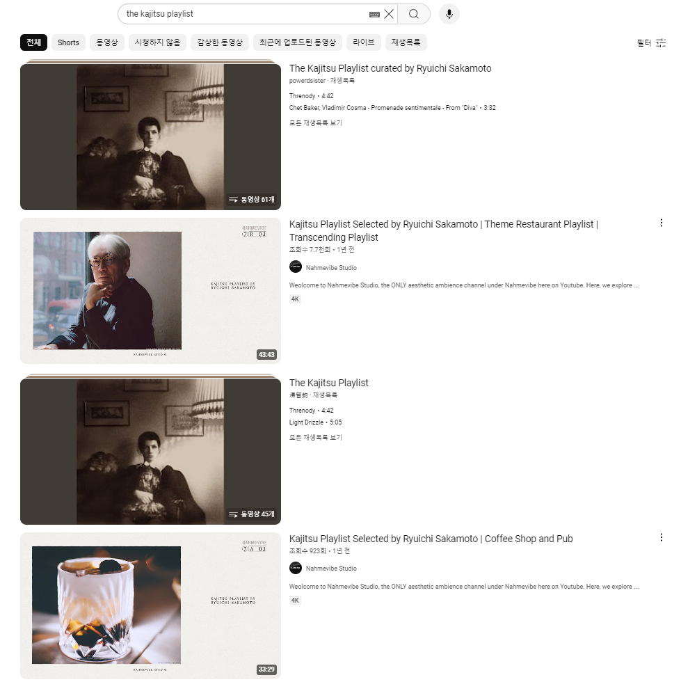 그로부터 한참 시간이 흐른 후 현대의 우리는 어떤가. 작곡가 사카모토 류이치는 뉴욕의 단골 일식 레스토랑의 배경음악이 마음에 안 들은 나머지 셰프에게 직접 편지를 써 플레이리스트를 제공한 바 있다. 해당 식당 이름을 따 ‘〈카지츠(Kajitsu)〉 플레이리스트’라고 불리는 이 플레이리스트는 잔잔한 분위기 속에서 식사를 즐기기에 적당한 곡들로 구성되어 있으며 스포티파이, 애플 뮤직, 유튜브 등에서도 검색으로 찾을 수 있다.