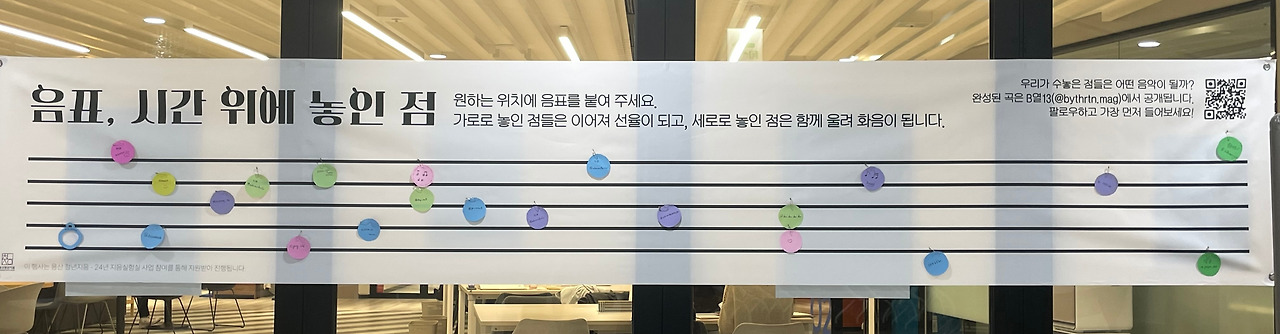 그중 전시장 한 켠에 커다란 오선보가 마련되어 있었는데요. 바로 “음표, 시간 위에 놓인 점” 입니다.