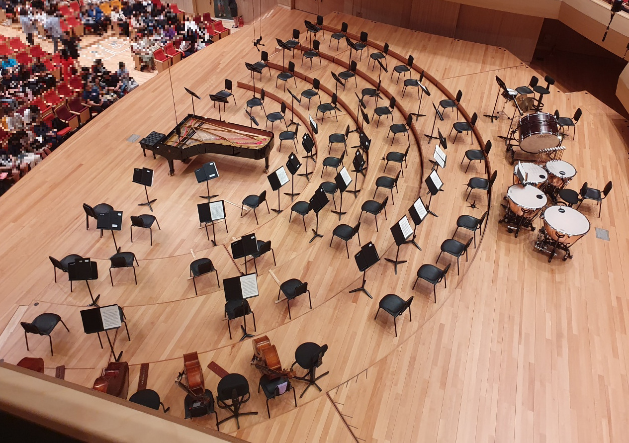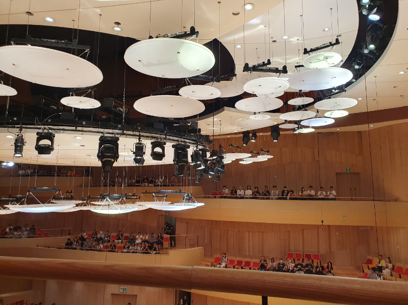 안으로 들어서니 지어진 지 일 년이 겨우 지난 신설 연주회장이어서인지 깔끔할 뿐만 아니라 설계에 있어 인상 깊은 지점이 몇 군데 눈에 띄었다.
