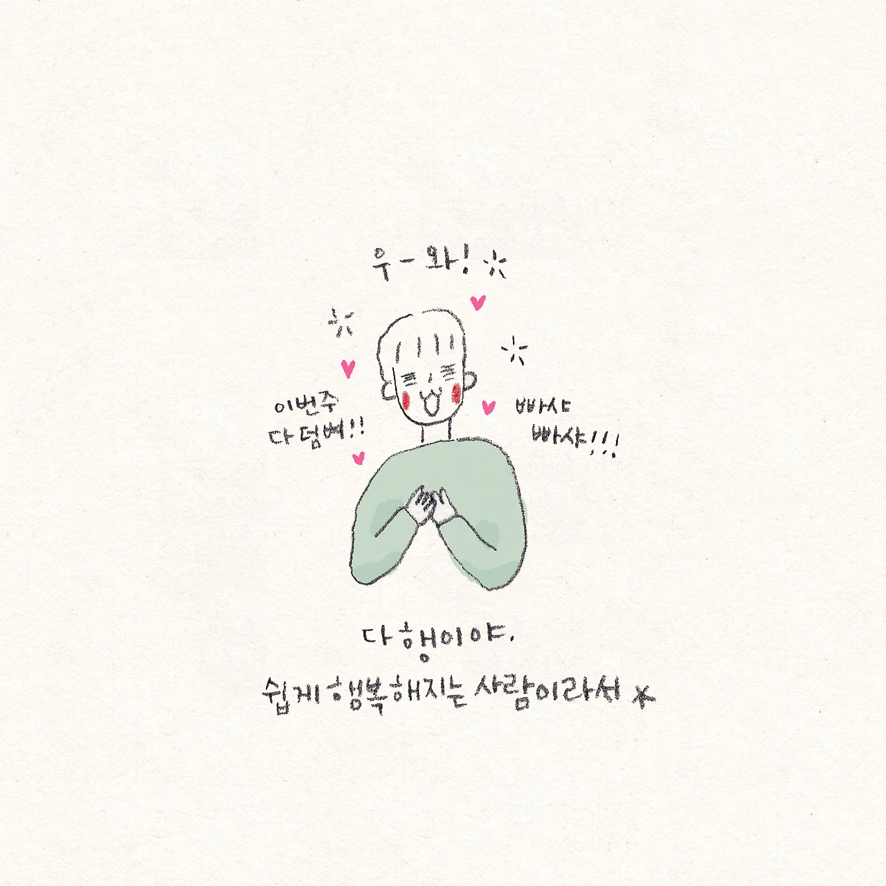 그리고 귀여운 것을 본다. 마음이 꼬물꼬물해지는 키티 크라우더의 그림책. 요즘 푹 빠진 순끼의 웹툰 <세기말 풋사과 보습학원>. 무해한 웃음의 유튜브. 재재의 <문명특급>, 영지의 <차린 건 쥐뿔도 없지만>, 김신영이나 김호영의 활약상 모음 같은 것들… 빼곡한 일정 사이사이 토막토막 찾아본다. 열심히 웃는다. 억지로라도 웃는 것은 마음에 굉장한 운동이니까.