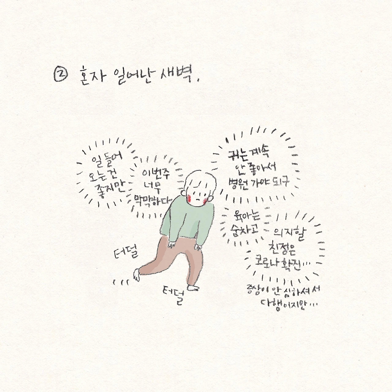쉽게 얘기하면 높은 산에 오른 것처럼, 비행기가 이륙할 때처럼, 물 속에 머리를 담근 것처럼 귀가 먹먹해져서 내 숨소리와 말소리가 귀에 계속 울리는 거다. 바깥 소리를 잘 듣는 것도 쉽지 않고, 내 목소리가 어떻게 나가는 지도 알 수 없다. 내 경우에는 체력이 떨어질 때 간간이 나타났고, 눕거나 고개를 숙이면 사라지곤 했는데 이번엔 좀 심각했다. 아침에 일어나면 증상이 시작돼서 밤에 누워 잠들 때까지 계속되었다. 하루 종일 내 숨소리를 최고 데시벨로 듣고 있자니(심지어 누군가와 대화할 땐 듣기 위해 숨을 참아야…) 정신이 혼미해질 지경. 아이들과 얘기할 때 높아지는 내 목소리에 귀가 찢어질 듯이 울려서 놀라 휘청한 적도 여러 번. 모든 감각이 쉴 새 없이 내 귀에 시달리니 위의 증상 설명처럼 정말 우울증이 올 것 같았다.