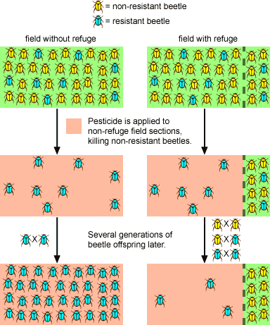 그렇다면, 이렇게 빠른 진화로 인한 살충제 저항성 유전자의 전파 속도를 늦추려면? 진화론을 역으로 이용하는 유전학을 이용하면 된다. 일단, 저항성 유전자가 없는 개체들이 불어날 수 있는 피난처를 제공한다. 전체 경작 면적 중 일부를 살충제 없이 남겨두는 것이다.