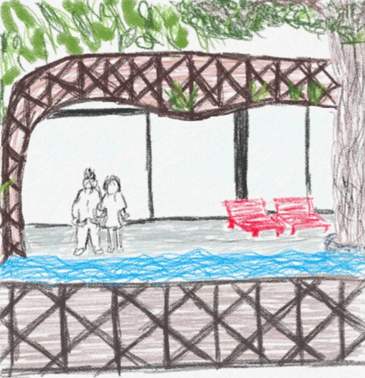 침대를 떠나자마자 수영복을 입었다. 모닝 수영 겸 어설프게 아쿠아 요가를 좀 해봤다. 풀장 중앙을 뚫고 있는 나무가 그늘을 만들어 준다.