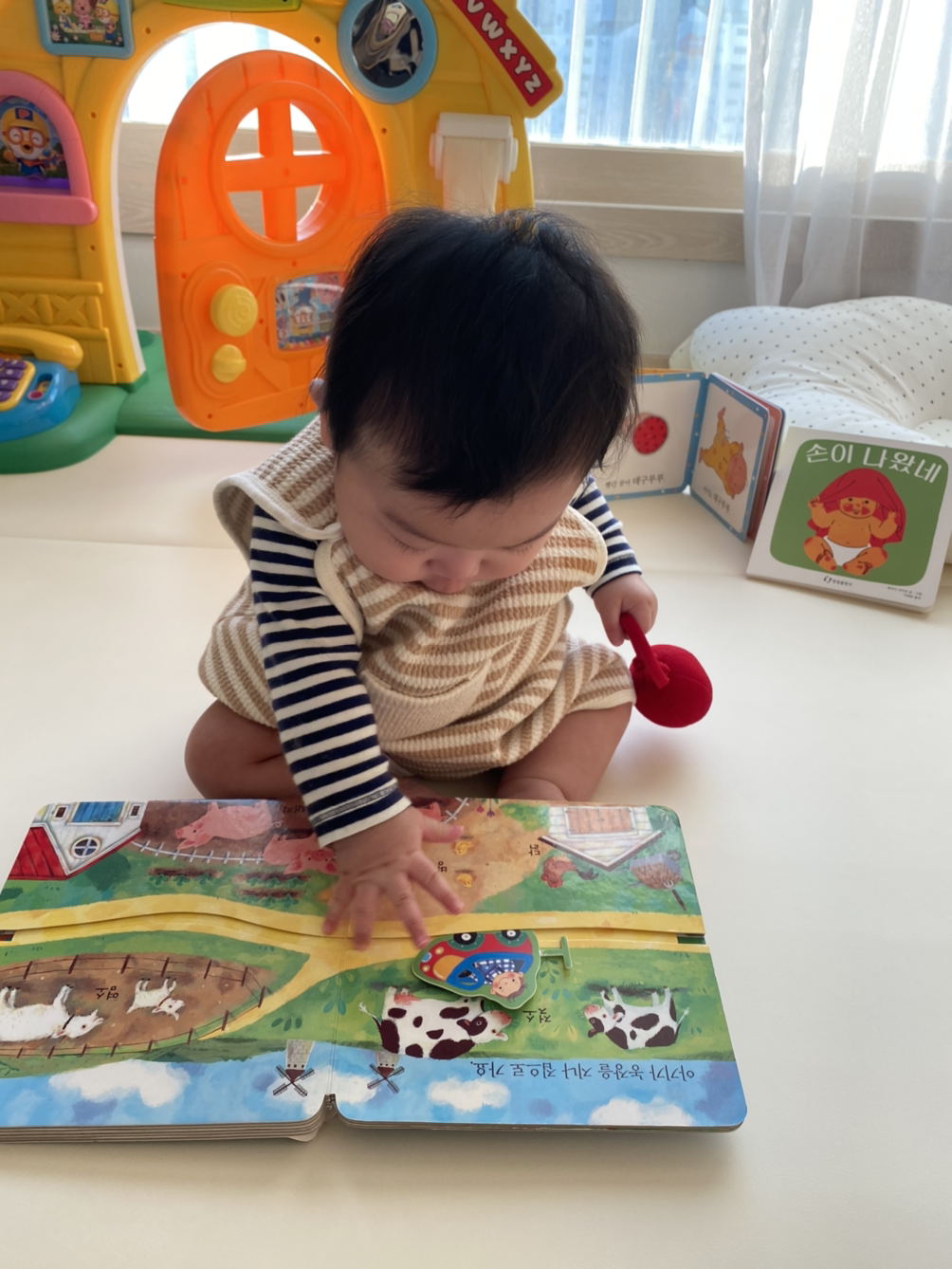 그리고 아기들은 책의 끝을 잡고 빨거나 여기저기 만져보는 행동 이외에 보드북 재질의 그림책은 조금씩 넘기기 시작했다.