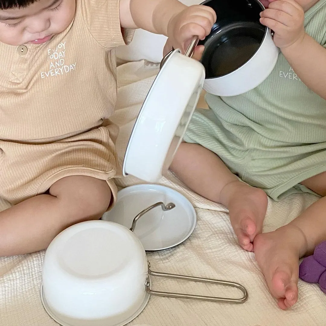 냄비는 뚜껑을 덮고 여는 것을 반복하며 놀이해보거나, 냄비의 손잡이에 리본 끈을 달고 마치 끌차처럼 끌어 볼 수 있다.