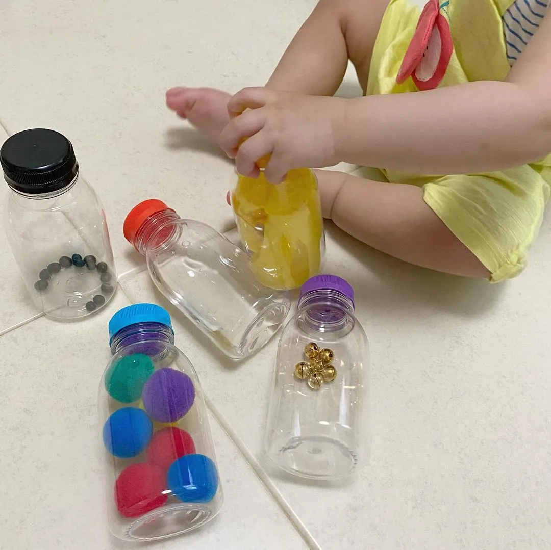 페트병은 주변에서 쉽게 구할 수 있고, 재활용이 가능하다. 또한 페트병을 가지고 할 수 있는 놀이들이 다양하기에 나는 일찍이 페트병들을 준비해 교구장에 넣어두었다. 페트병의 뚜껑을 열고 닫으며 눈과 손의 협응을 기를 수 있고, 페트병 마라카스를 흔들며 다양한 소리 탐색을 해 볼 수 있다.