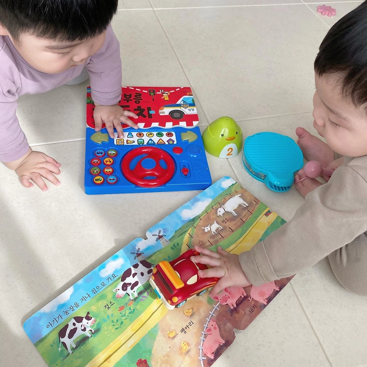 책 속에 자동차가 등장했다. “부릉부릉~자동차가 지나가네” 하면서 손으로 핸들을 돌리는 모습을 보여준다. (의성어+행동)