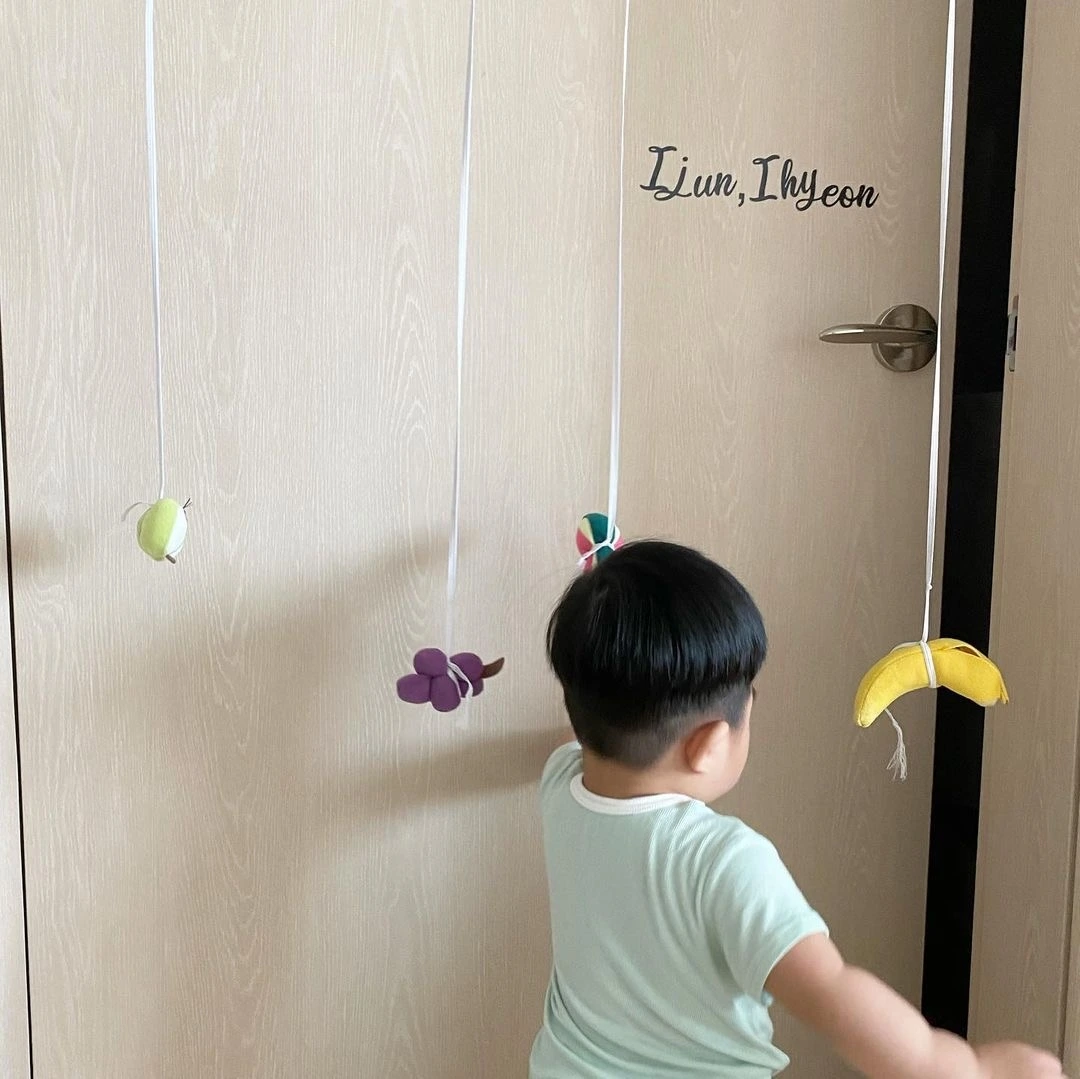 고무줄에 헝겊 과일이나 야채, 동물 인형 등을 달아두면 해당 사물들을 알아보는 인지 놀이를 해볼 수 도 있다.