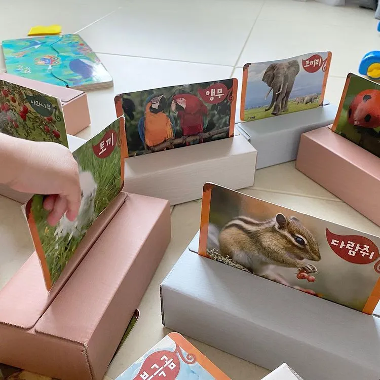 벽돌 블록 홈에 동식물 카드를 끼우고 어떤 동식물들이 있는지 이야기해줄 수 있으며, 엄마(아빠)가 말하는 동식물을 아이가 찾아보도록 한다.