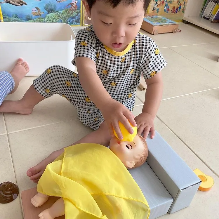 아직 아이들 스스로 구성물을 만들어 놀이하는 시기는 아니지만 벽돌 블록은 아이의 연령과 발달단계에 따라 다양하게 활용할 수 있기 때문에 일찍 구입해도 좋다.