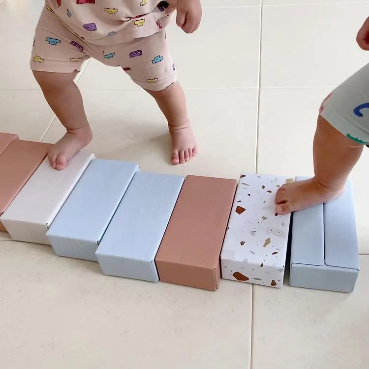 혹은 벽돌 블록을 한 개씩 띄엄띄엄 두고 징검다리를 만들어 볼 수 있다. 아직 이 시기 아이들은 스스로 징검다리 건너기를 어려워하기 때문에 아이의 손을 잡아주는 것이 필요하다.