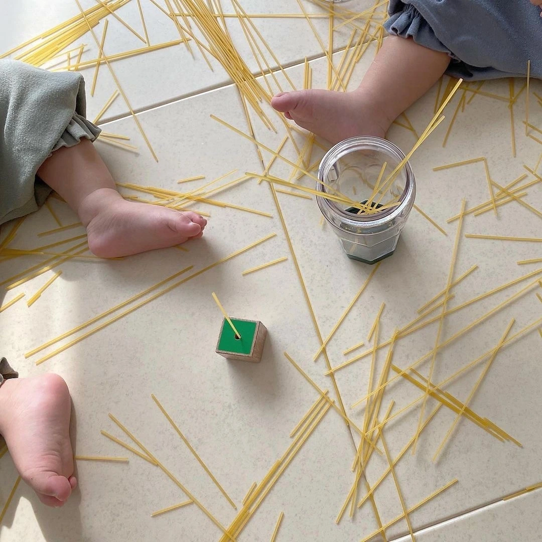 끈 끼우기 교구에는 모양 가운데 구멍이 하나 뚫려 있다. 이 구멍에 파스타면을 넣어보는 놀이를 한다. 끈 끼우기 교구가 없다면 면을 끼울 수 있는 작은 공간이 있는 물건은 무엇이든 괜찮다. 가령 두꺼운 빨대 안으로도 얇은 파스타면은 쏙 하고 들어간다.