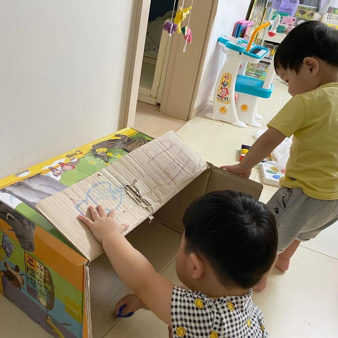 평소에 보던 작은 상자가 아닌 크기가 더 큰 상자. 거기에 상자를 활용한 다양한 놀이가 더 해진다면 아이는 상자 하나를 가지고 꽤 오래 놀이할 것이다.