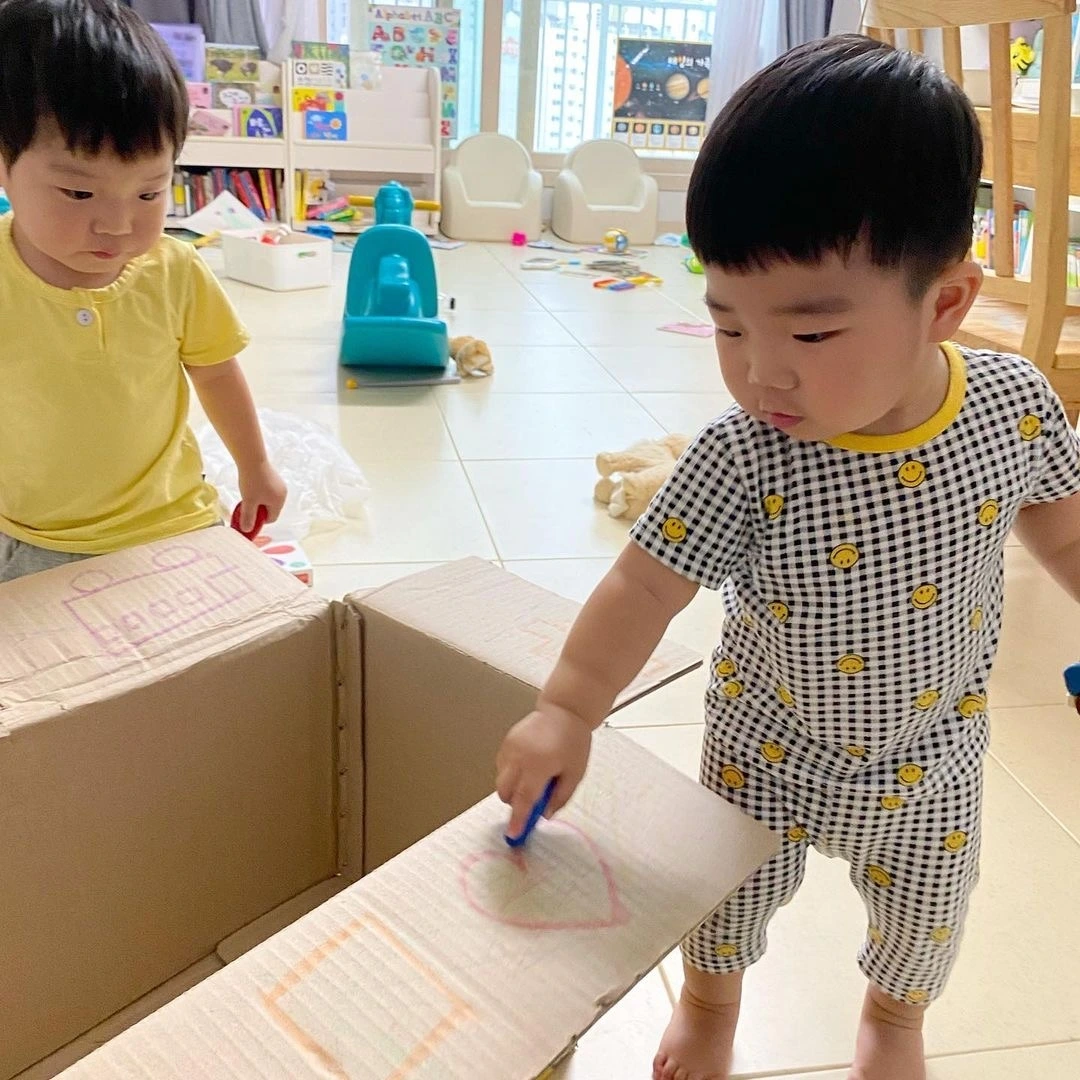 전지와 스케치북에서 끼 적 이를 할 때가 많으나 큰 상자에 끼적이기를 해 보는 것도 좋은 놀이가 된다. 상자 안에 들어가 벽면이나 바닥에 끼적이기를 해볼 수 있고, 상자 밖에 끼적이기를 해볼 수도 있으며 상자를 활용한 다양한 놀이들도 할 수 있다.