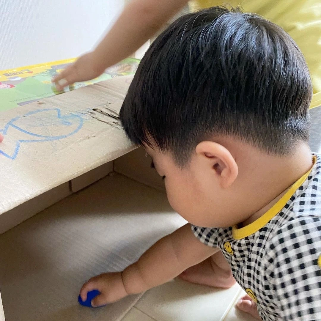 어딘가 공간으로 들어가길 좋아하는 아기들에게 큰 상자는 매우 좋은 놀이 자료가 된다.