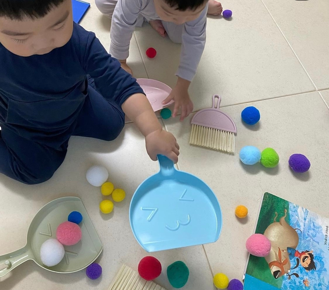 쓰레받기에 빗자루로 쓸어 담는 것은 아이들이 빗자루 사용에 조금 익숙해졌을 때 제공해주는 것이 좋다.