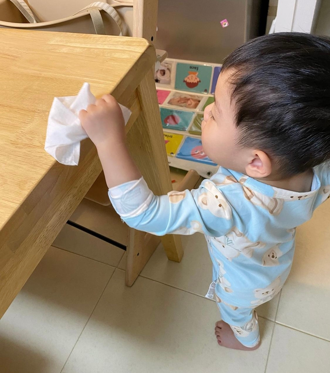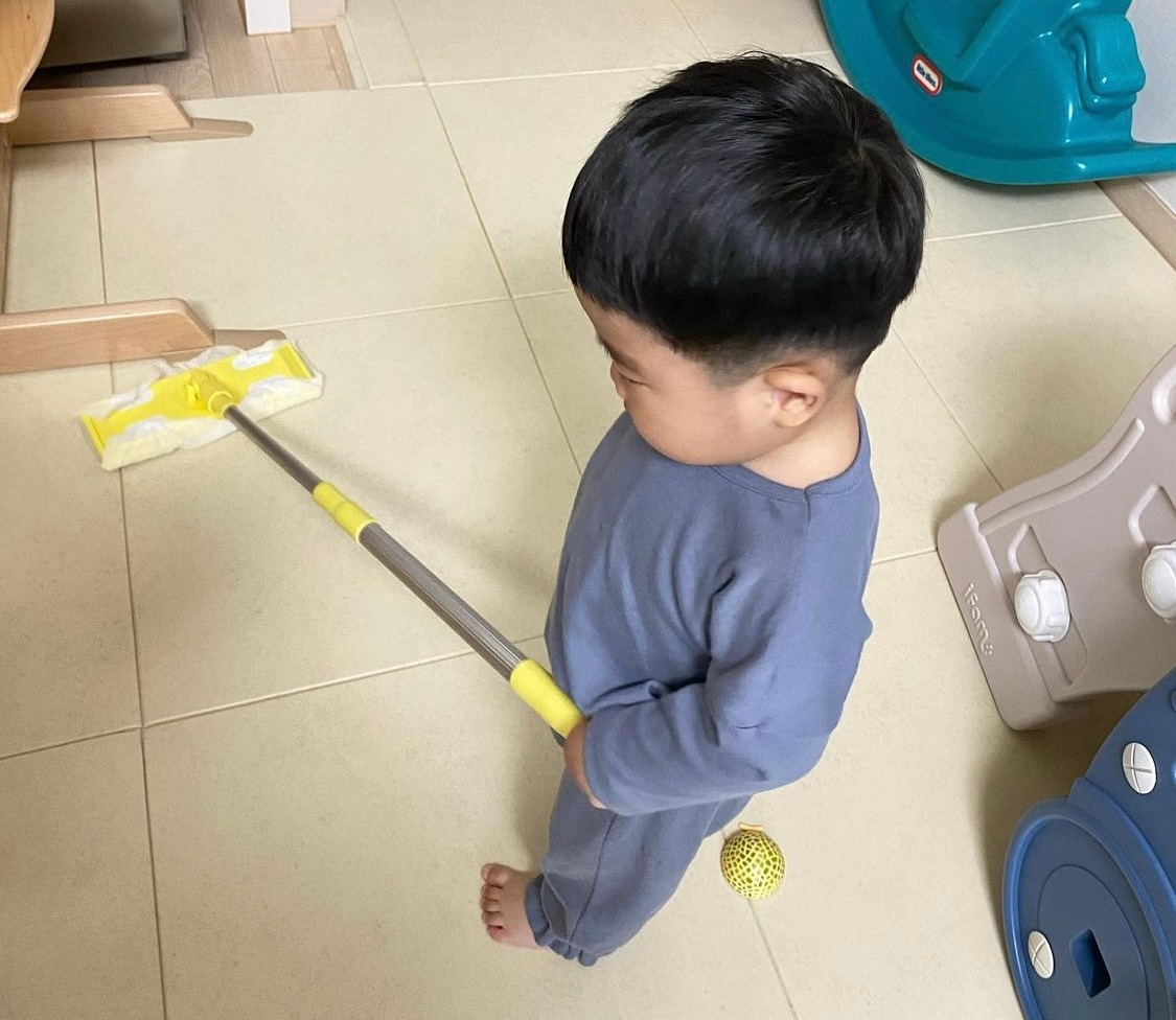 아이가 밀대를 잘 밀 수 있도록 바닥에 놓아둔 물건들을 치워 넓은 공간을 만들어 준다.