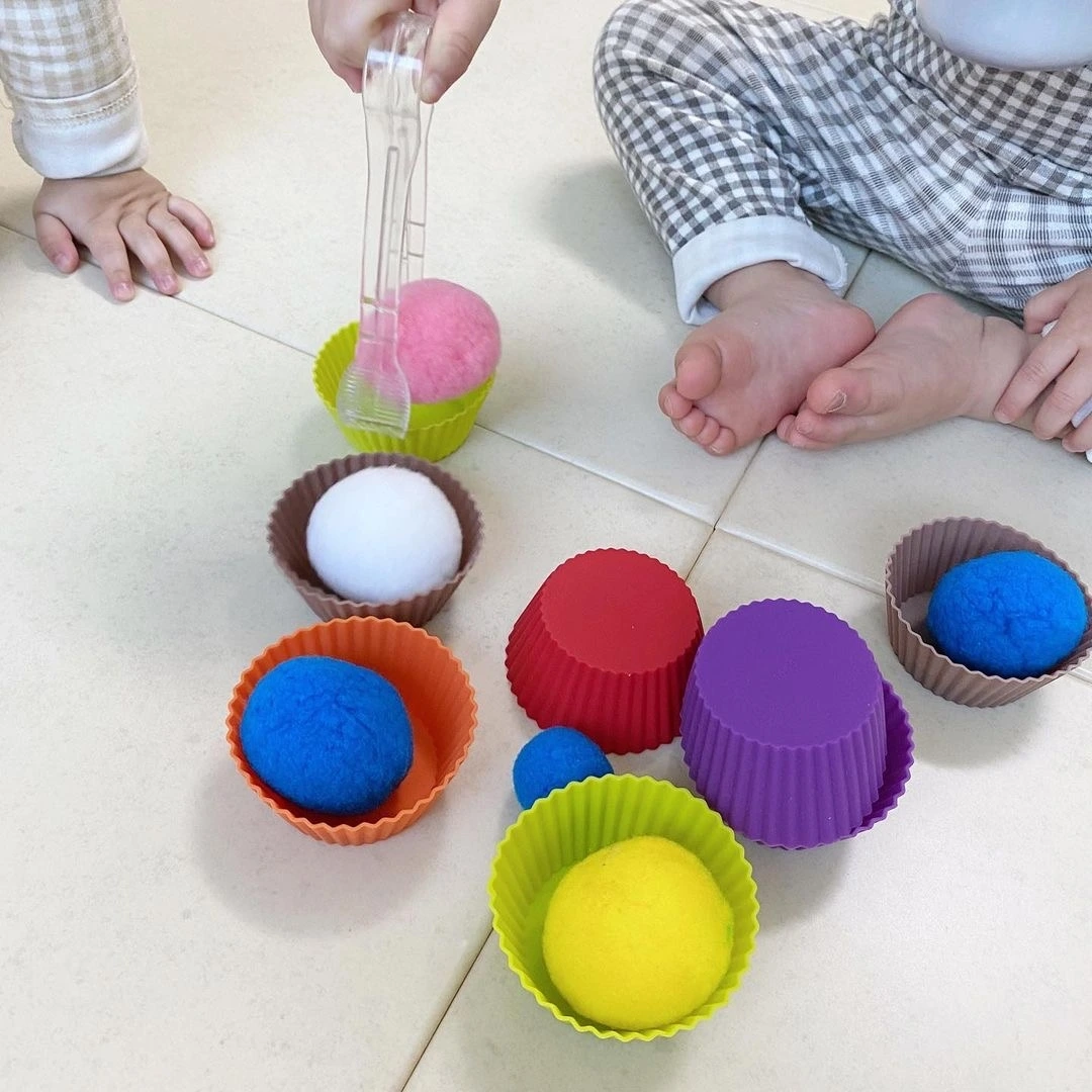 집게와 같은 도구를 제공해 집게로 솜 공 등을 잡아 머핀틀안에 넣어보는 놀이를 하면서 놀이를 다양하게 해 보는 것도 좋다.
