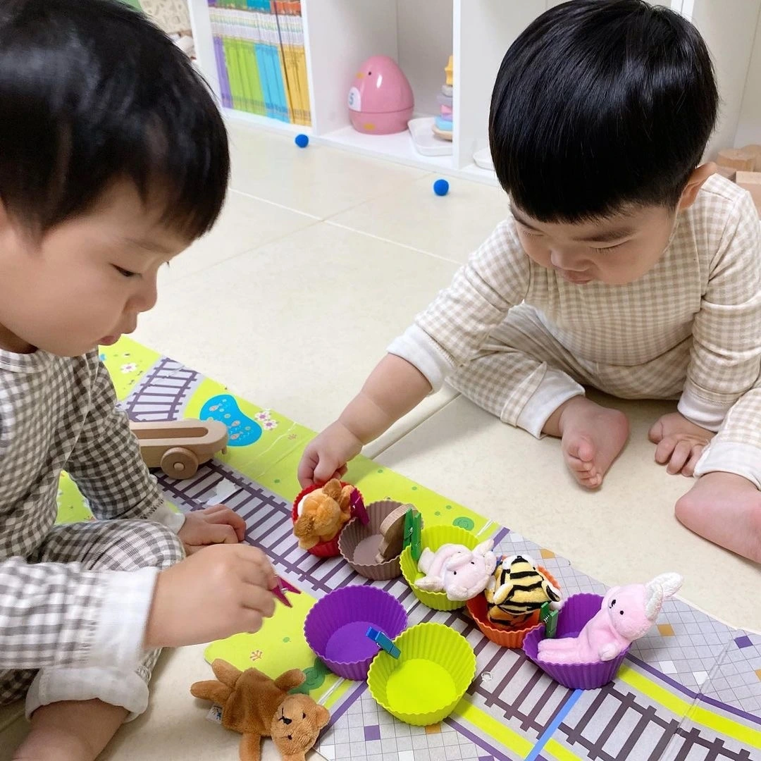 특히 놀잇감들을 넣을 때 머핀틀의 색깔과 같거나 비슷한 색깔의 놀잇감들을 넣으면서 색깔 놀이를 해볼 수도 있다.