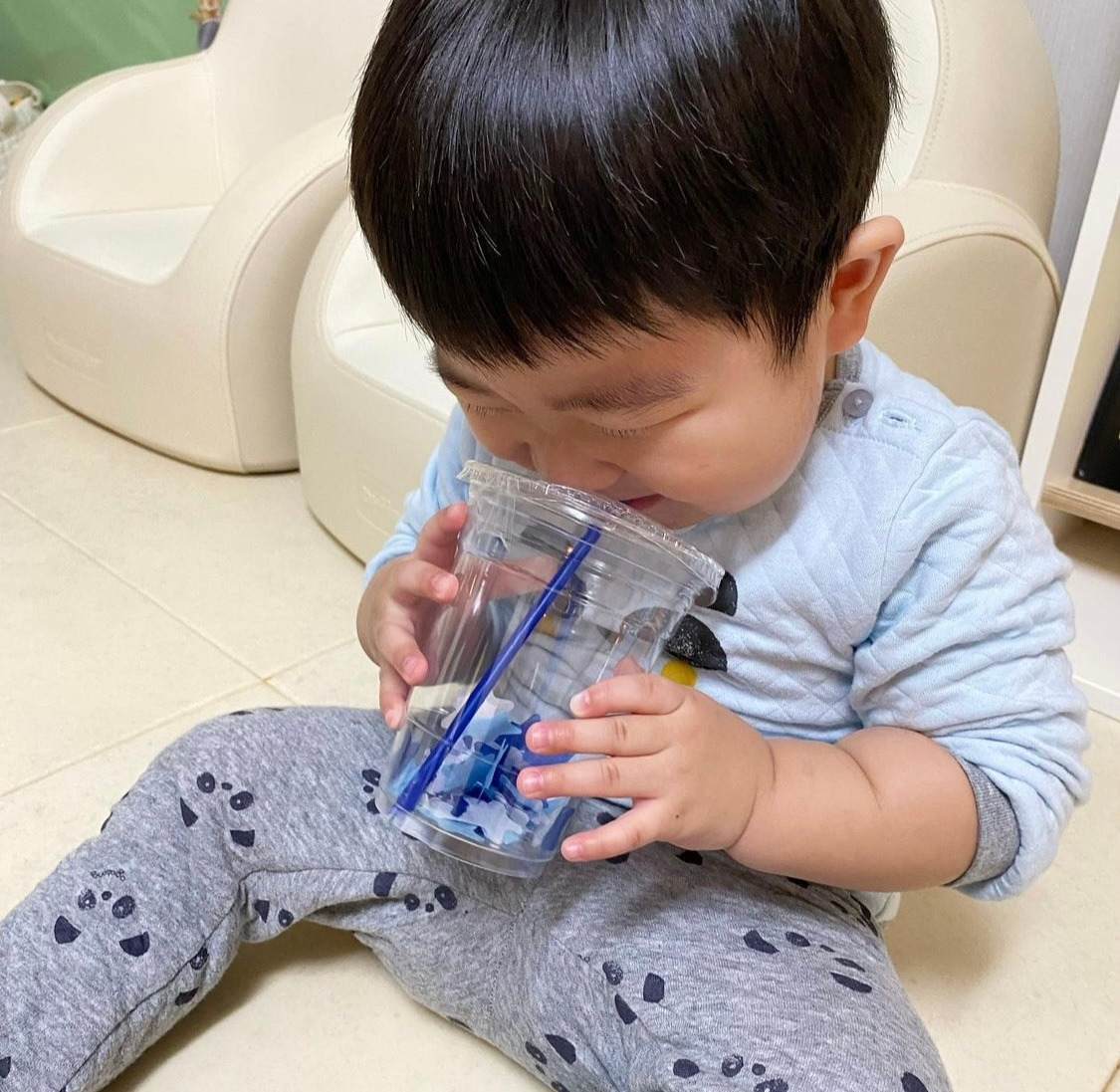 있는 힘껏 빨대를 불면 컵 안에서 움직이는 종이가루들을 관찰할 수 있는데, 빨대에 입을 대고 바람을 불어본 경험이 부족하여 처음에는 컵 안에서 움직이는 종이가루를 관찰하기 힘들 수 있다. 때문에 일회성으로 놀이하기보다 아이가 이 놀이를 하고 싶으면 반복해서 해볼 수 있도록 교구장에 비치해놓는 것을 추천한다.