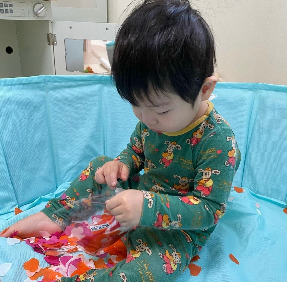 종이가루는 쉽게 날아가고 정리 시 시간이 걸릴 수 있기 때문에 놀이매트를 펼쳐 그 안에서 탐색놀이를 하는 것도 좋다.