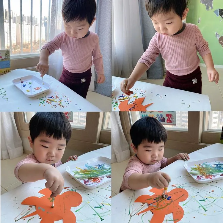 또한 면봉은 길이가 짧고 작은 도구로 면봉을 물감을 묻혀 찍어보면서 소근육의 힘을 기르고 집중력 향상도 도모할 수 있다.