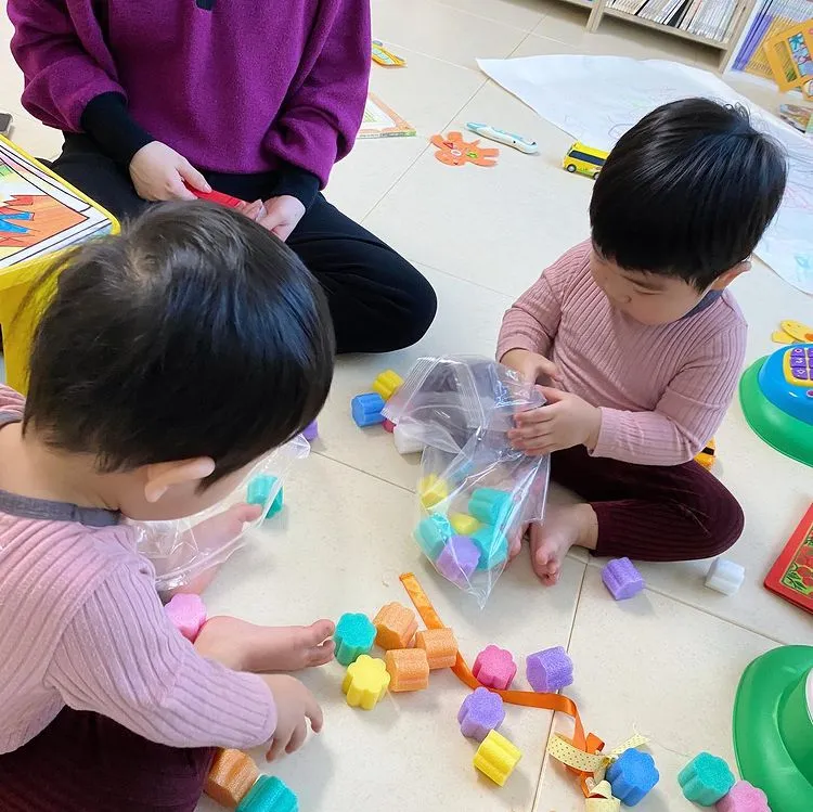 꽃송이폼을 지퍼백이나 통에 담고 쏟아보며 놀이하는 것도 아이들은 매우 집중해서 한다.