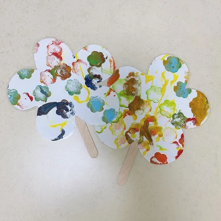 과일꽂이를 꽂은 꽃송이 폼으로 물감놀이를 해본다. 과일꽂이를 꽂은 꽃송이 폼을 도장처럼 활용해 과일꽂이 부분을 잡고 물감을 묻혀 종이에 찍거나 그으며 놀이하는 것이다.