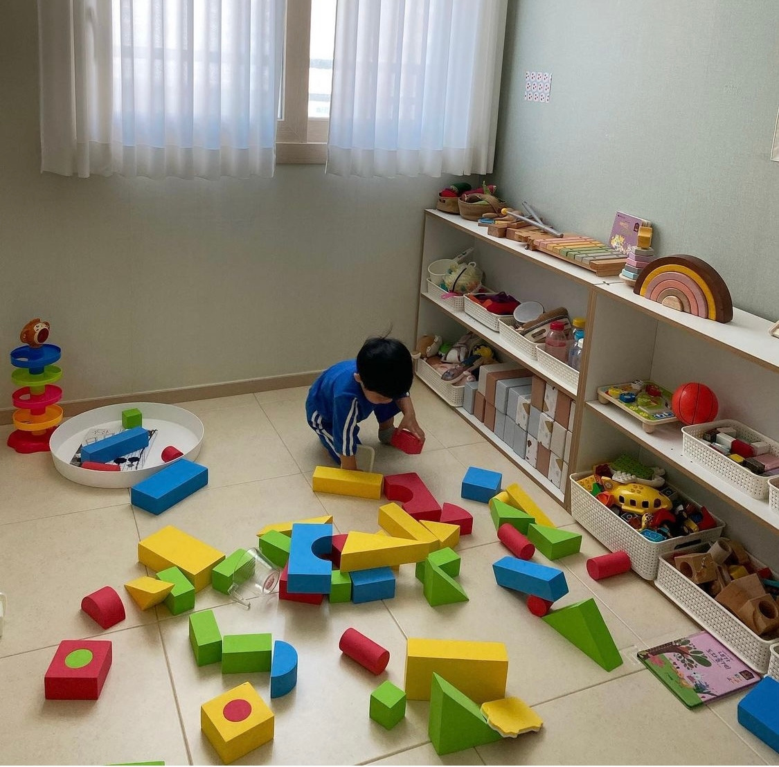 이 시기에 아이들이 블록을 안전하게 쌓고 놀면서 여러 가지 모양들을 조금씩 만들어 볼 수 있도록 가볍고 모양과 색이 다채로운 우레탄 블록을 준비했다.