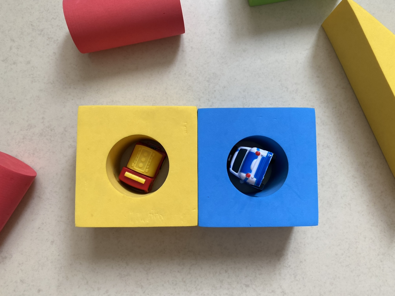 우레탄 블록 중에는 동그라미 원형이 쏙 들어가는 사각형 블록이 있다. 원형을 빼면 사각형 가운데 구멍이 뚫려 있는데 이 블록으로도 여러가지 놀이들이 가능하다.