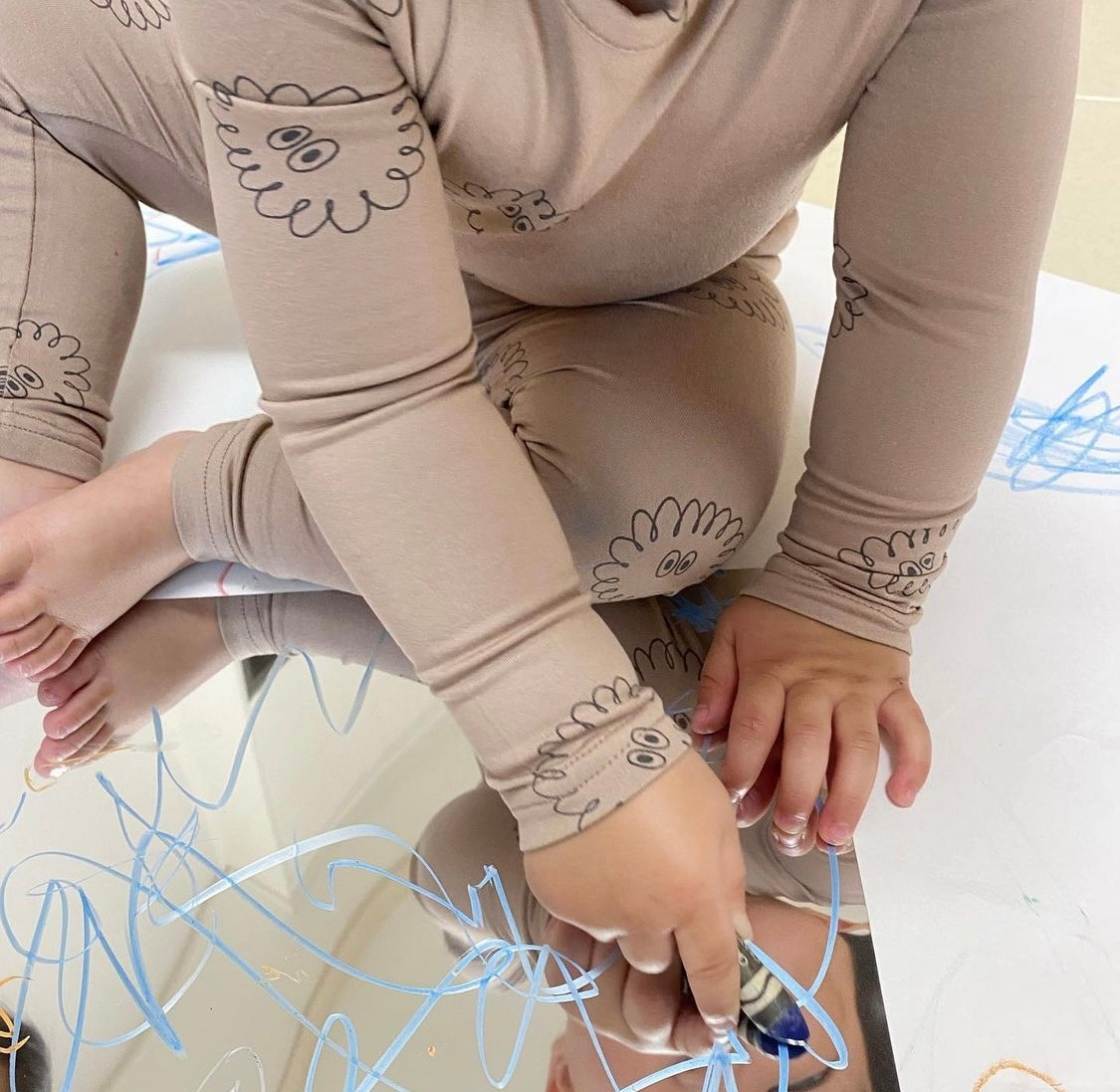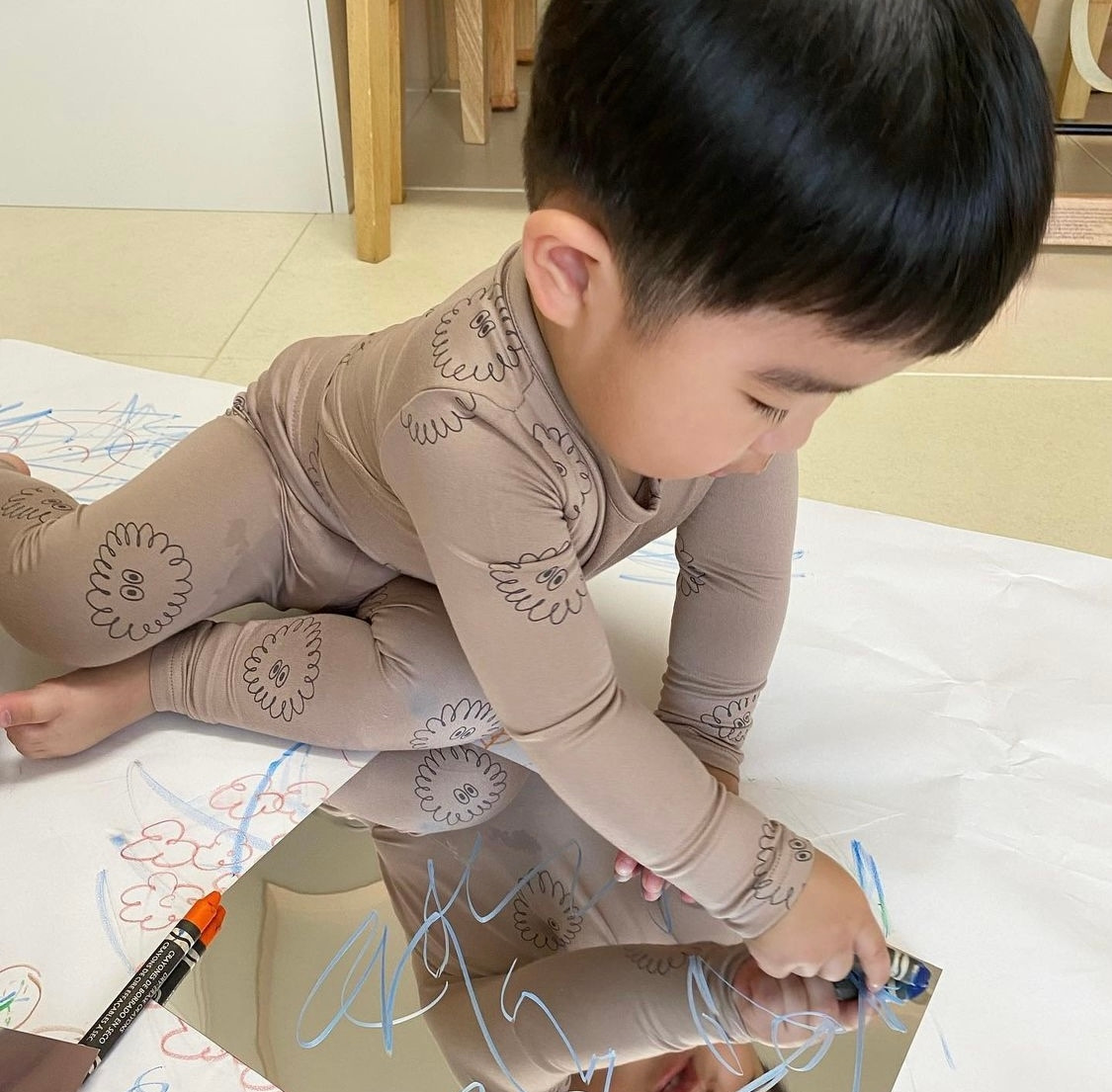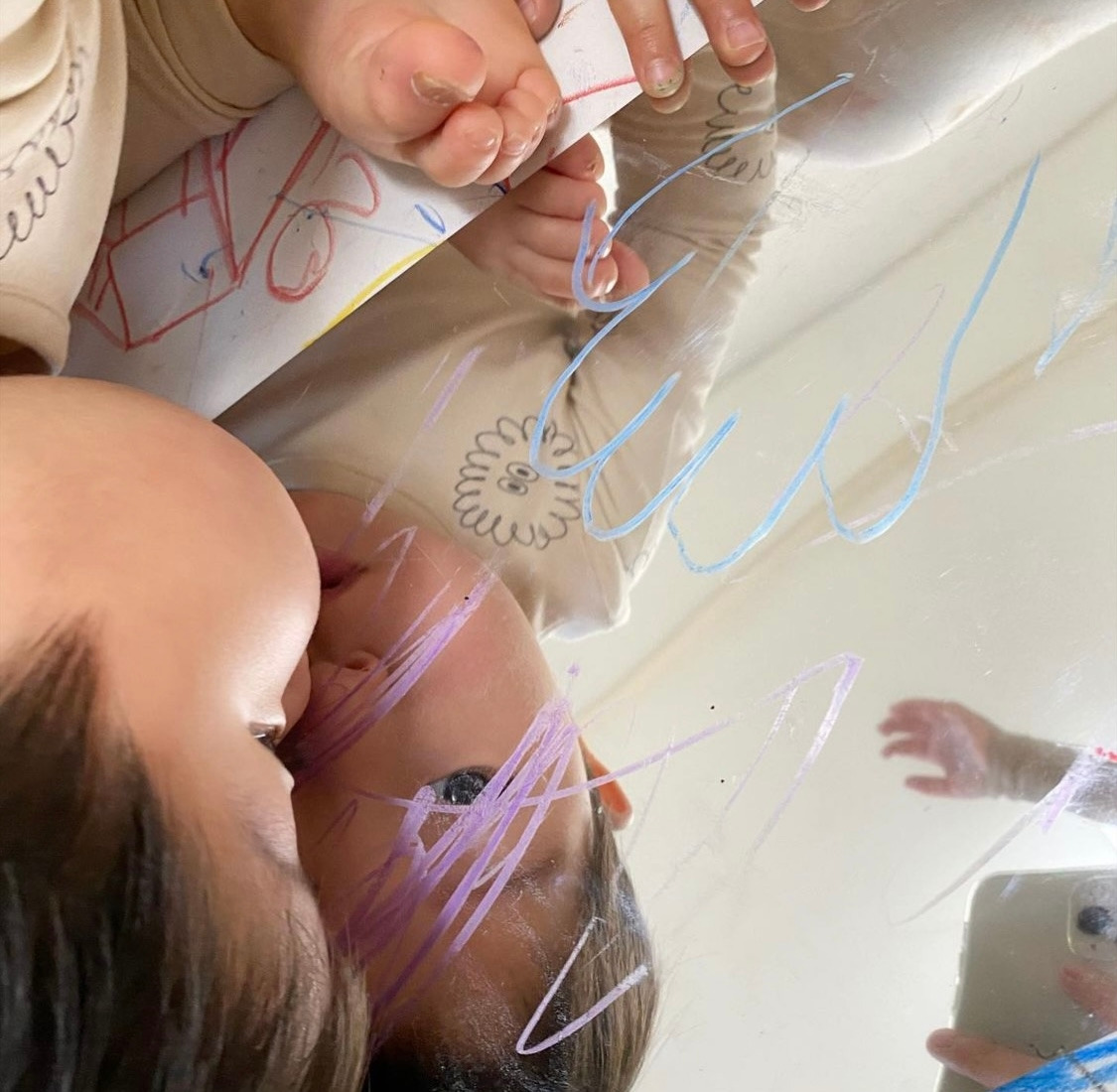 크레용을 제공해주고 거울지 위에 자유롭게 끼적여 볼 수 있도록 한다.