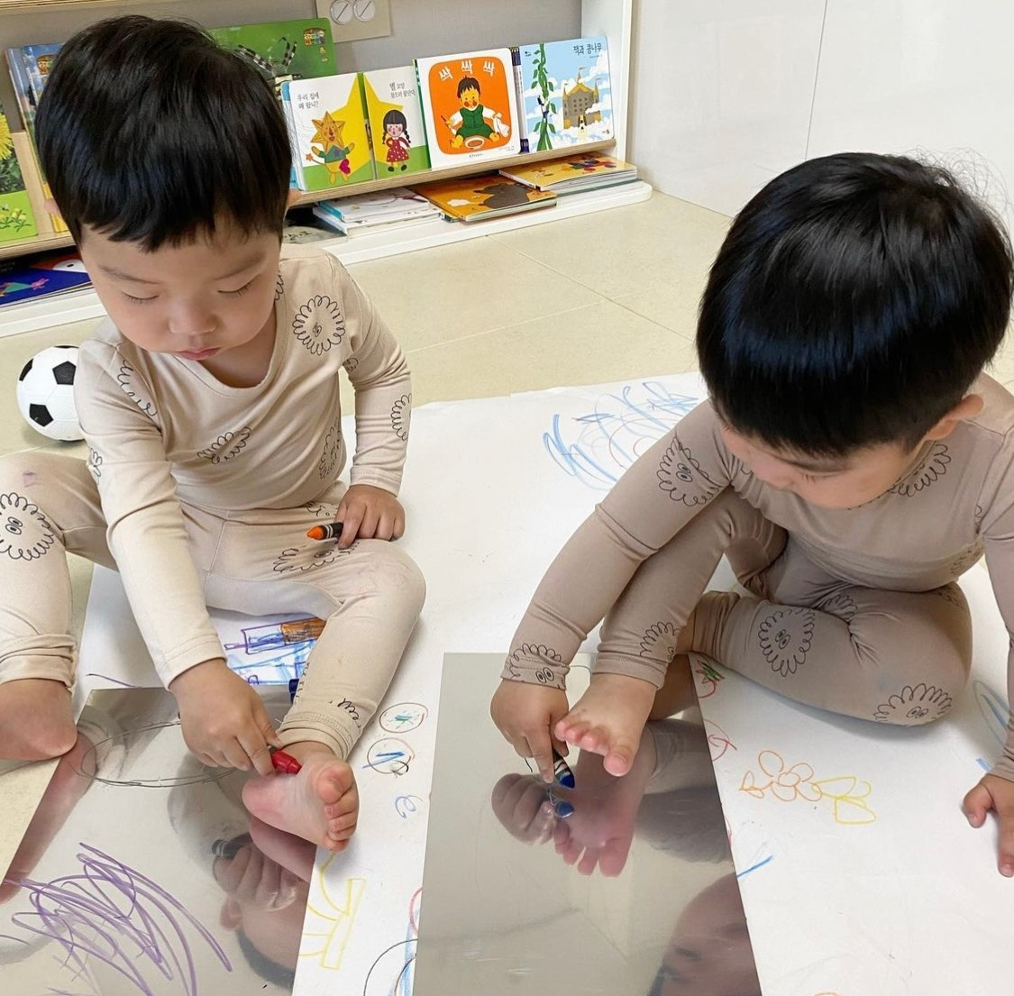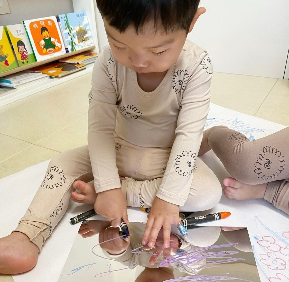 아이와 함께 거울지에 그림을 그린 뒤, 거울지를 벽면에 붙여 둔다. 마치 거울 처럼 거울지를 활용하는 것이다.