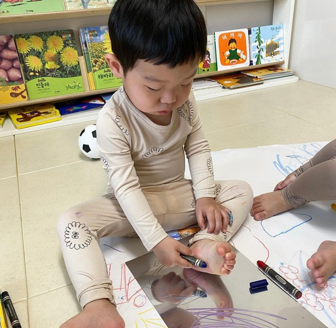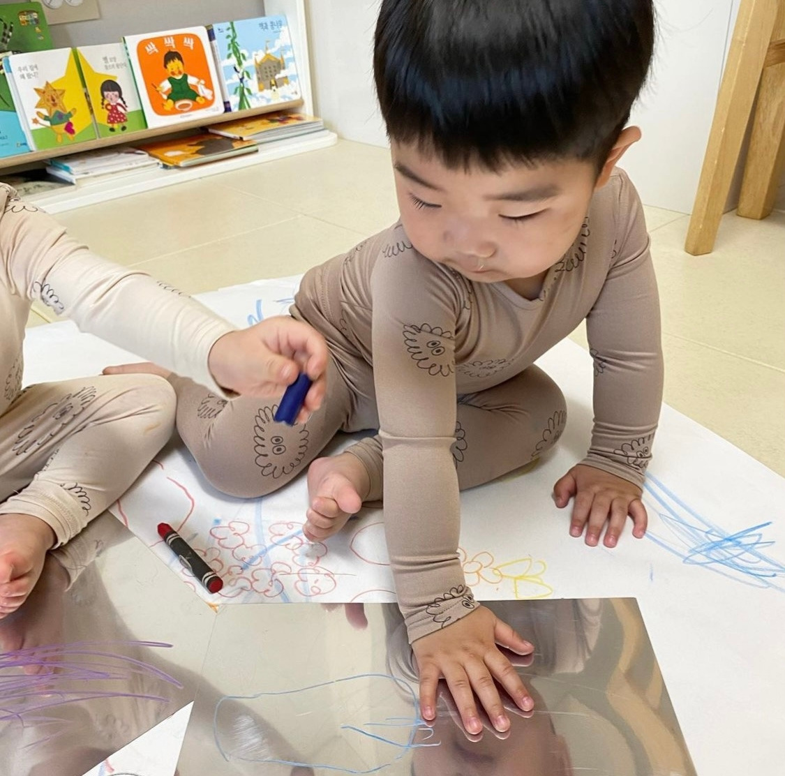 거울지에 끼적여보기 전 거울지를 보며 거울 놀이를 해본다. 거울에 얼굴을 대고 내 얼굴을 살펴볼 수도 있으며, 손이나 발등 다른 신체 부분을 비춰볼 수도 있다.
