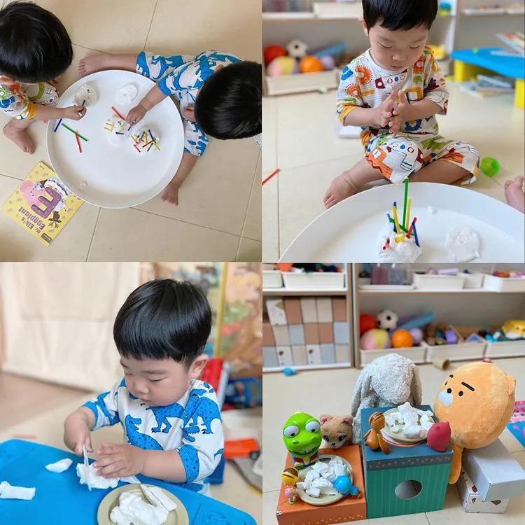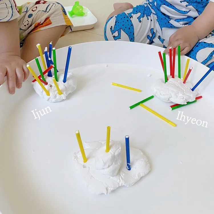 점토 이외에 색깔 빨대를 추가적으로 준비하는 것으로 할 수 있는 놀이를 소개한다. 빨대를 꽂아보며 눈과 손의 협응을 기르고 소근육 발달을 도모할 수 있으며, 색깔 빨대로 놀이하며 색인지에도 도움을 줄 수 있다.
