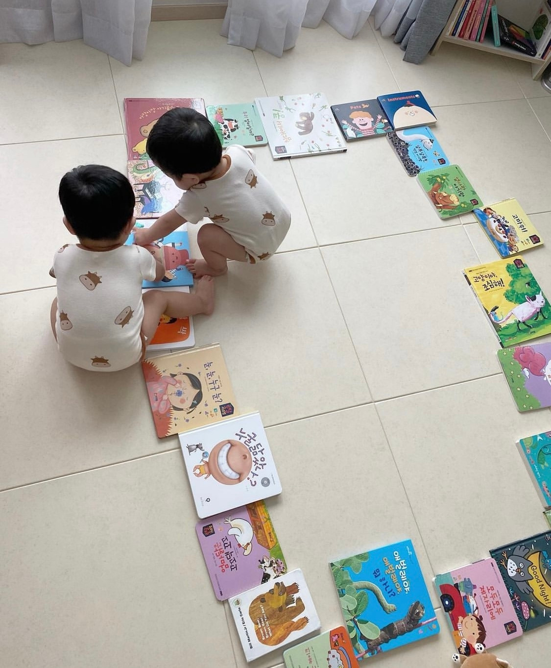 아직 걷지 못하는 돌 전의 아기들과 그림책 길 놀이를 한다면, 먼저 성인이 그림책 길을 만들어 둔다.