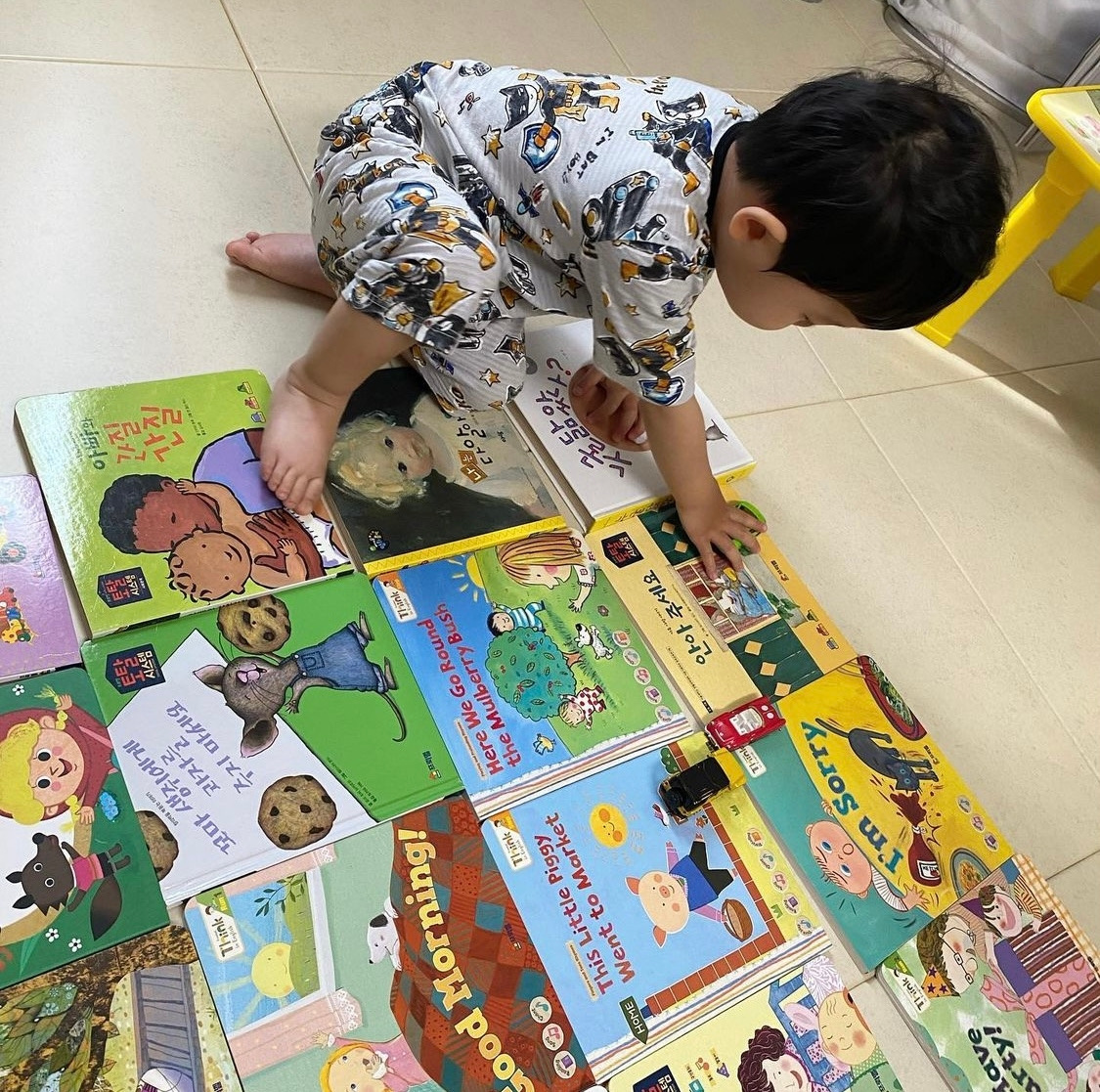 선택한 주제의 그림이 나온 그림책들을 찾아 바닥에 펼쳐 둔다. 책의 겉표지일 수도 있고, 뒤표지나 페이지 중 일부일 수도 있다. 어디든 상관없이 아이가 좋아하는 것이 잘 보이도록 책을 펼쳐 두면 된다.
