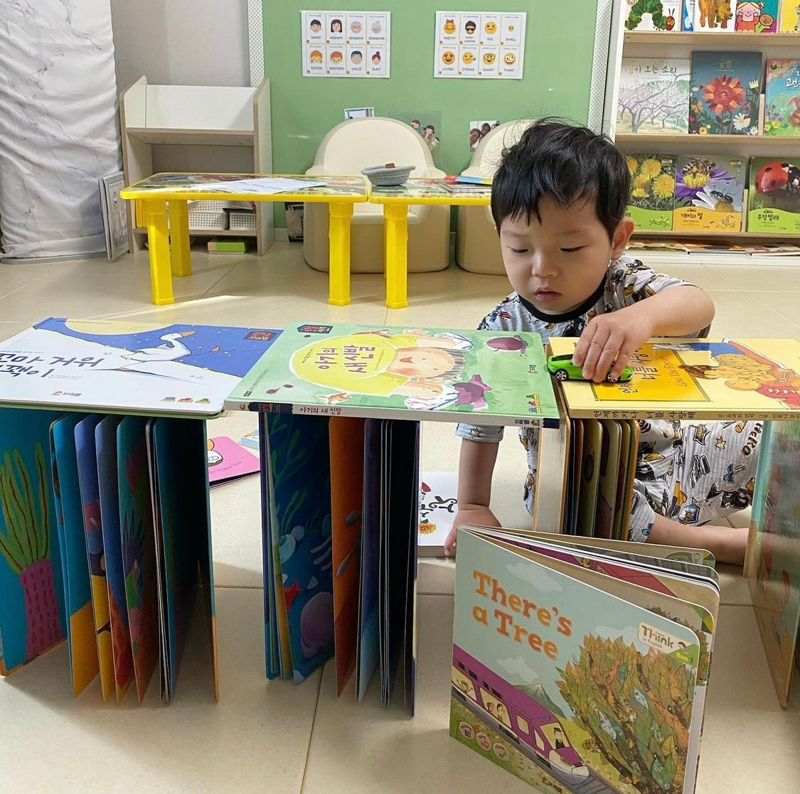 그림책을 꺼내 바닥에 길게 나열해 길을 만든다.
