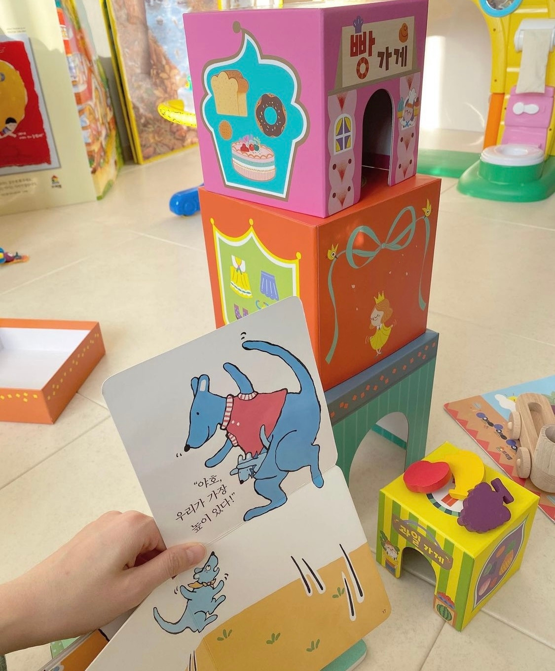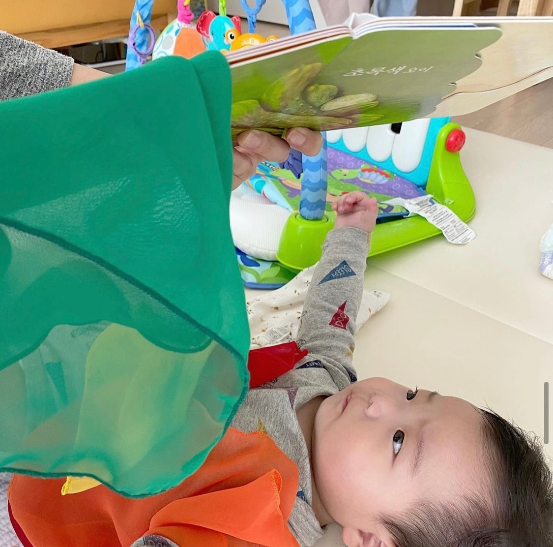 까꿍놀이를 좋아한다면 까꿍놀이 주제의 책을 보고 까꿍놀이를 하면 된다. 혹은 주제에 상관없이 책을 보고 그림 책위에 스카프를 덮거나 등 뒤로 숨긴 뒤 “까꿍” 하며 보여주는 등 책으로 까꿍놀이를 해본다.