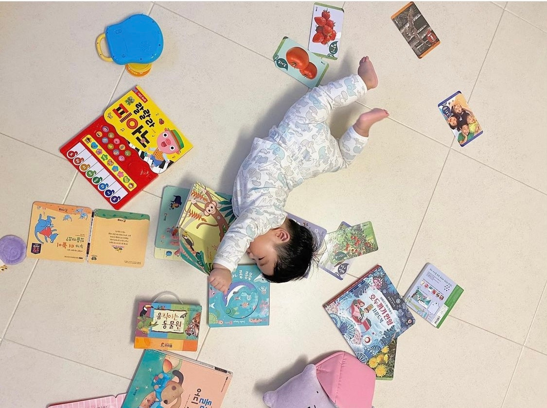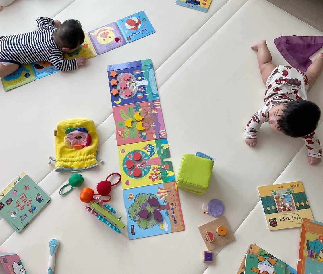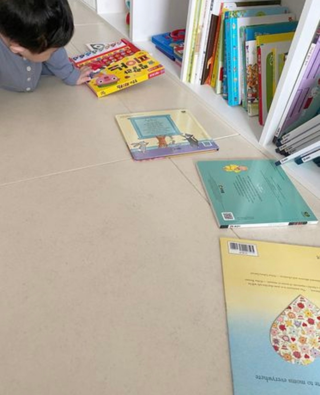 벽에 기대어 놓아도 되고, 바닥에 펼쳐두어도 된다. 아기가 엎드려서, 기어 다니면서 볼 수 있도록 아기의 생활공간에 그림책을 둔다.