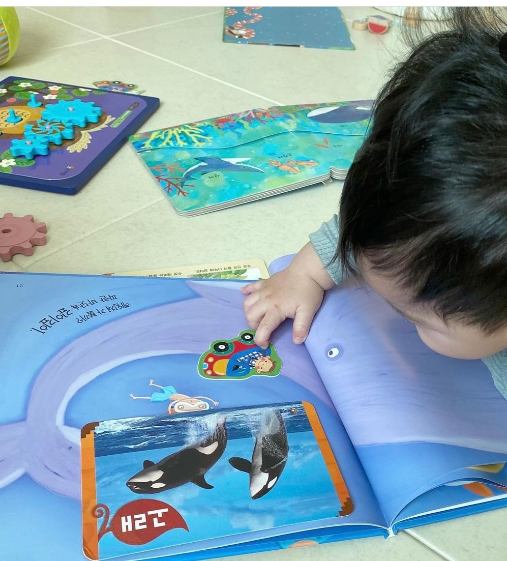 그림책을 발견한 아기들은 스스로 책장을 넘겨 보기 위해 시도하기도 하고, 넘길 수 있다면 책을 넘겨 보기도 한다. 아기가 보는 책의 겉표지를 함께 보고 "돌고래가 있네~", "빨간 사과가 있구나"하며 보이는 사물을 말해주고, 책을 넘겨 보면 함께 책을 읽어준다.