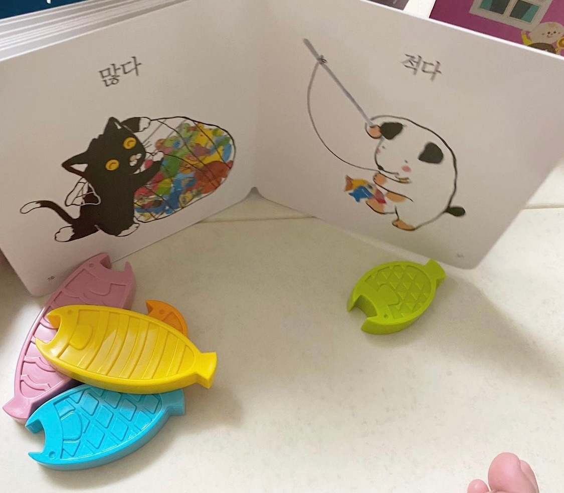 '많다'는 표현이 나왔다. 놀잇감을 많이 모아 '많다', 한쪽에는 몇 개만 두고 '적다'라며 말해준다.